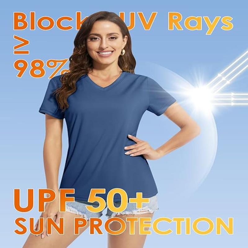 Features: Short sleeve, casual, print-tag, v neck, soft, durable, cooling, sunblocking, sunproof, anti UVA UVB, without pockets, hoodless, no built in bra