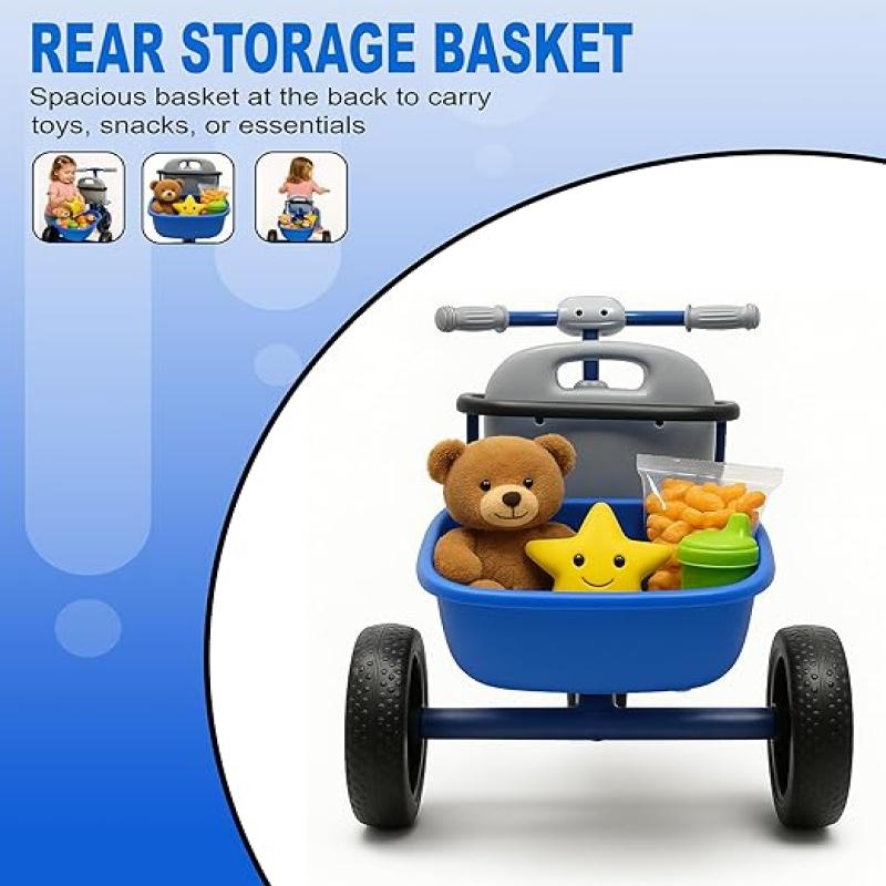 Spacious Rear Basket for Toys & Essentials – Designed with a large rear basket, this tricycle for toddlers lets children carry their toys, snacks, or favorite items wherever they ride. It adds functionality to playtime, making the tricycle more than just a ride-on toy. Parents love the storage convenience, while kids enjoy imaginative play. This makes it a top choice for buyers looking for a baby tricycle with basket or tricycle for baby 1 to 5 years.