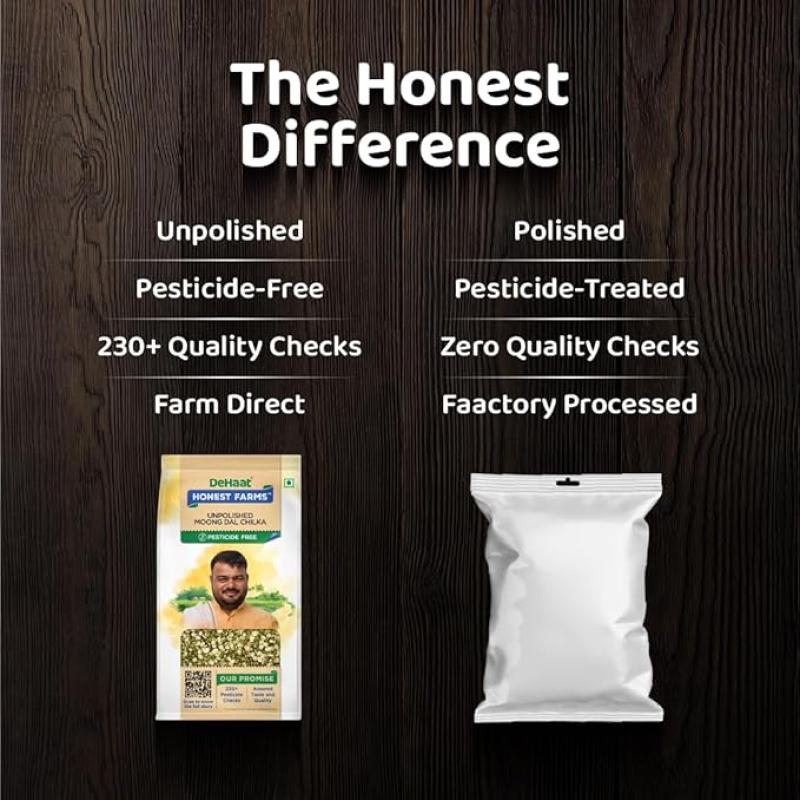 SOURCED DIRECTLY FROM FARMERS: DeHaat Honest Farms Unpolished Moong Dal Chilka is responsibly sourced straight from Indian farmers who use traditional, pesticide-free farming methods. This farm-direct model ensures maximum freshness and promotes sustainable livelihoods for farming communities.