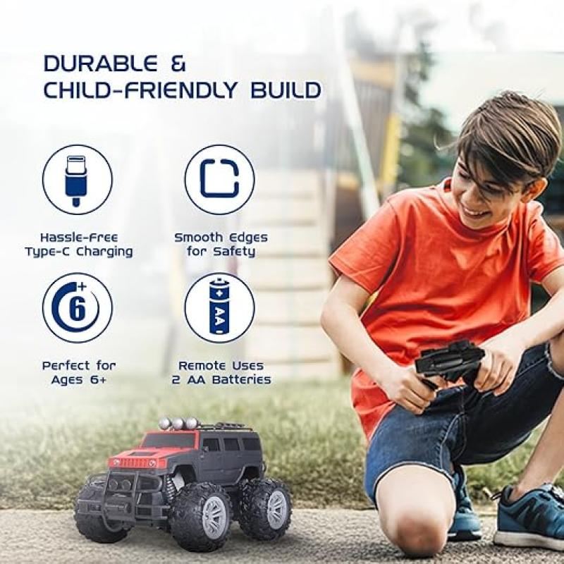 • Easy Charging - Features USB Type-C charging with included cable — no need to remove the battery for charging! Anti-Skid off Roading Tyres. Ultra-smooth spring suspension Charging indicator with On/Off switch