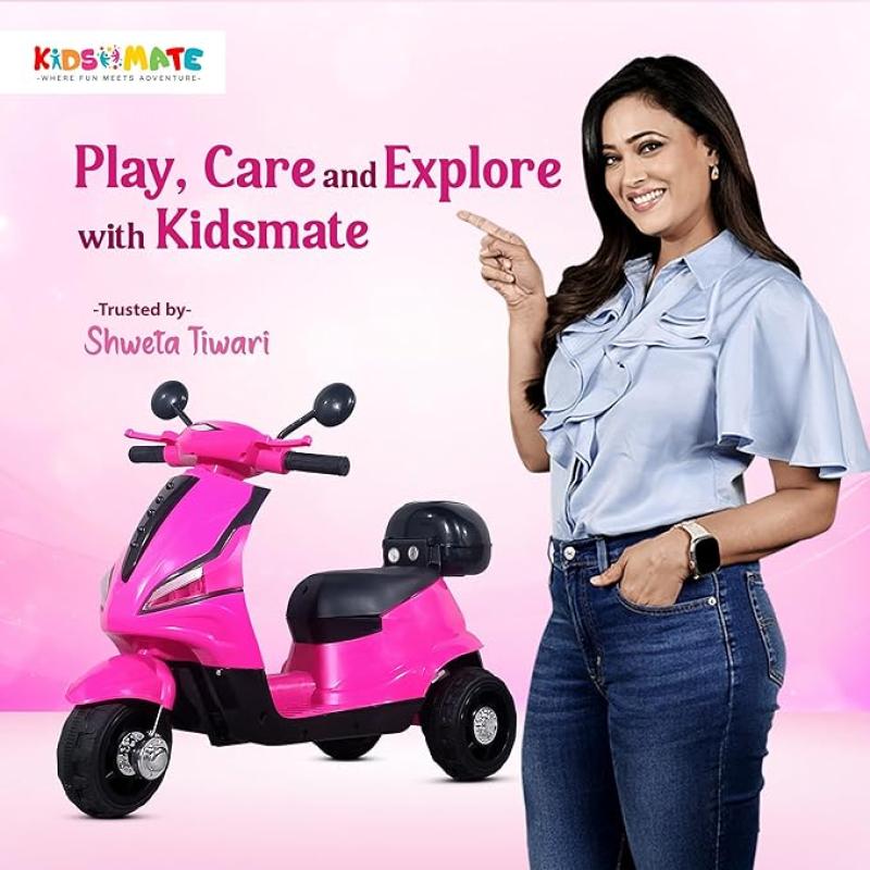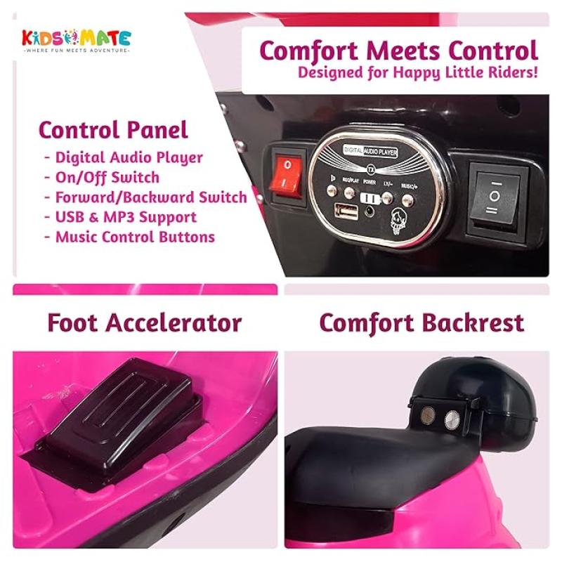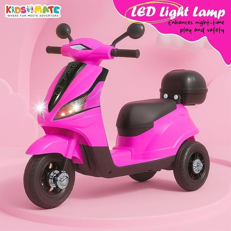 Kidsmate Swift Electric Scooter for Kids | Battery Operated Ride-On Toy with Music & LED Headlights | Wide Seat, Foot Accelerator with Front and Back Storage compartments | for Ages 2-6 Yrs - Pink