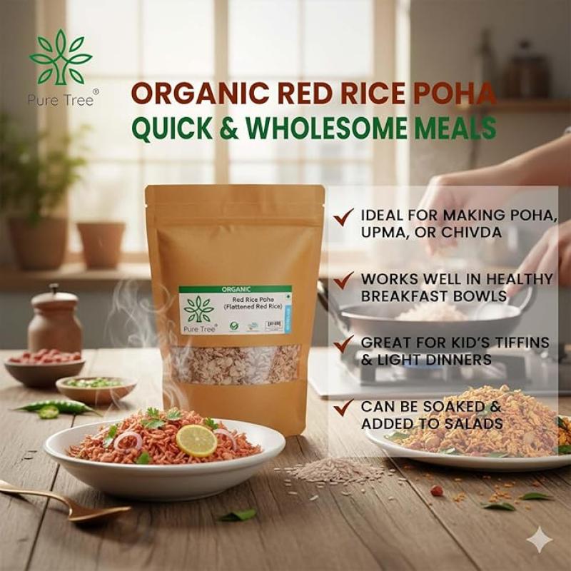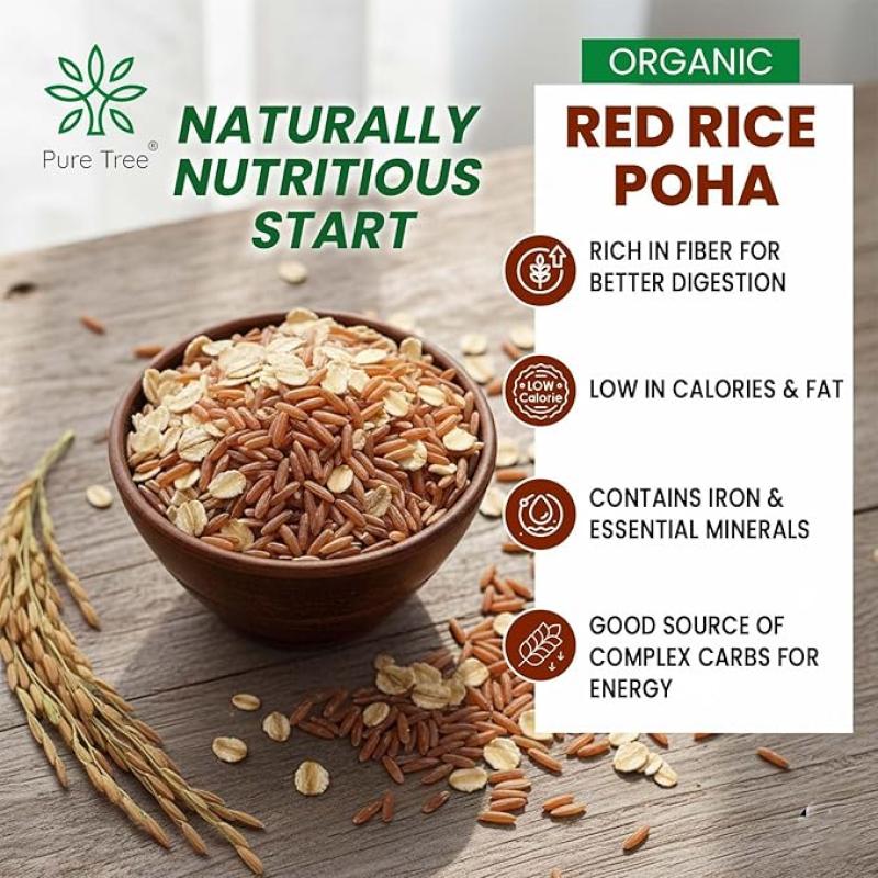 Pure Tree Certified Organic Red Poha | 850 g | Red Aval | Red Rice Flakes | Red Rice Poha | Flattened Rice | Beaten Rice | Avalakki, Atukulu, Chira, Pohe, Phovu, Chivda | Gluten-Free