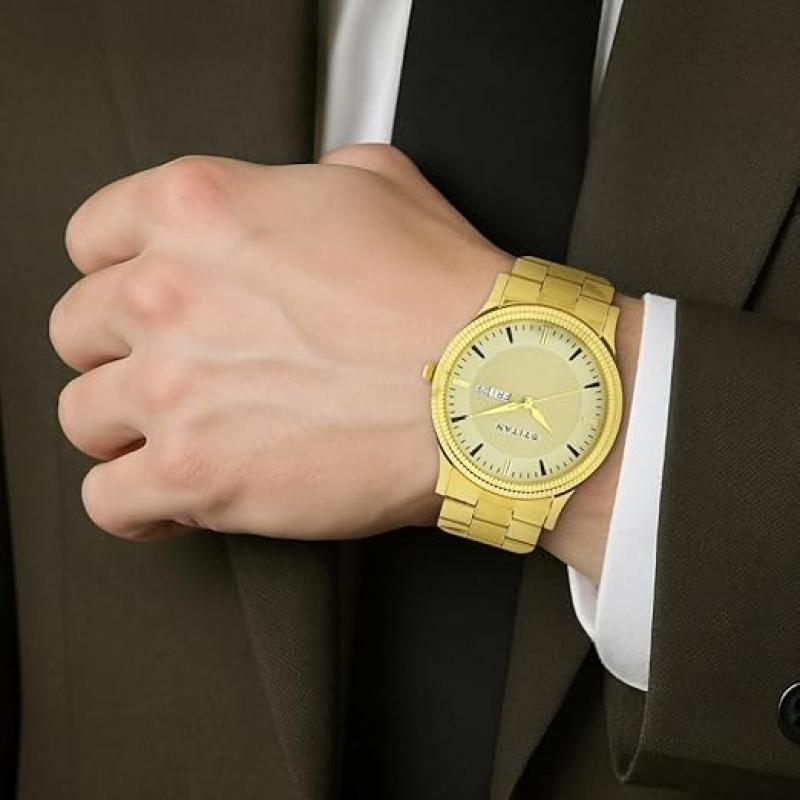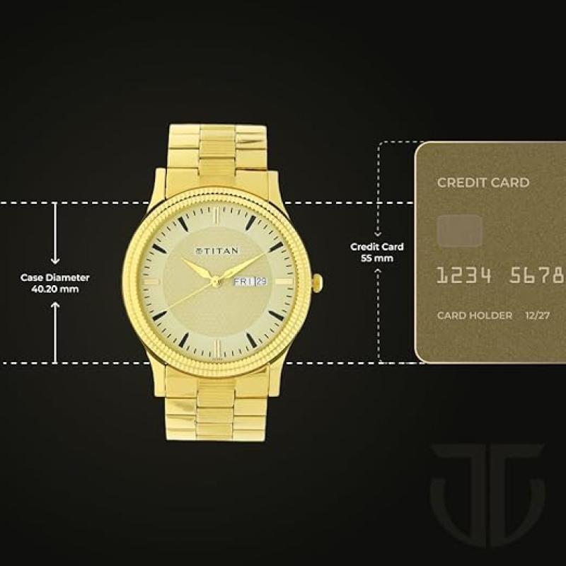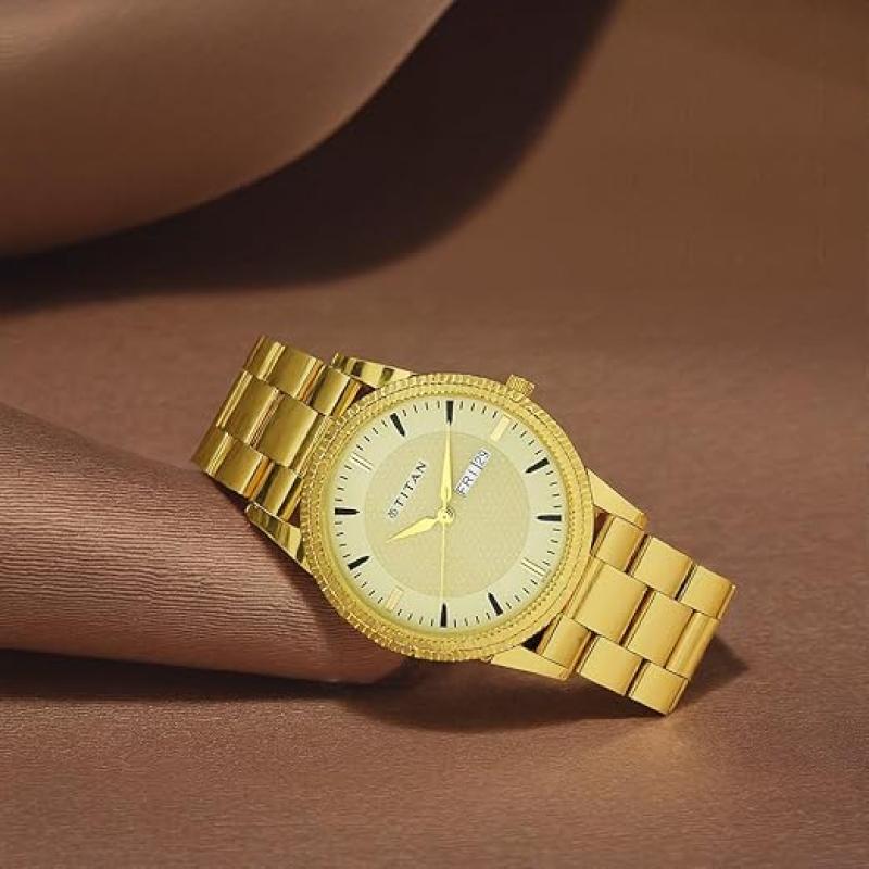 Titan Quartz Analog with Day and Date Golden Dial Stainless Steel Strap Watch for Men-NS1650YM04