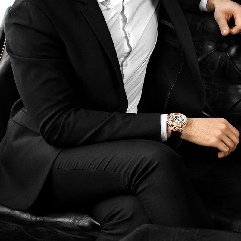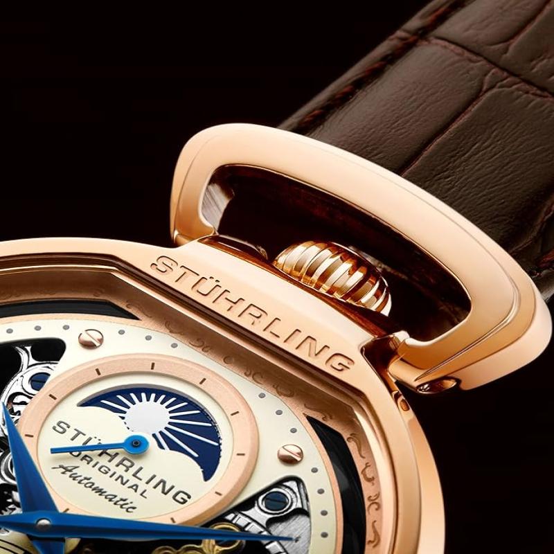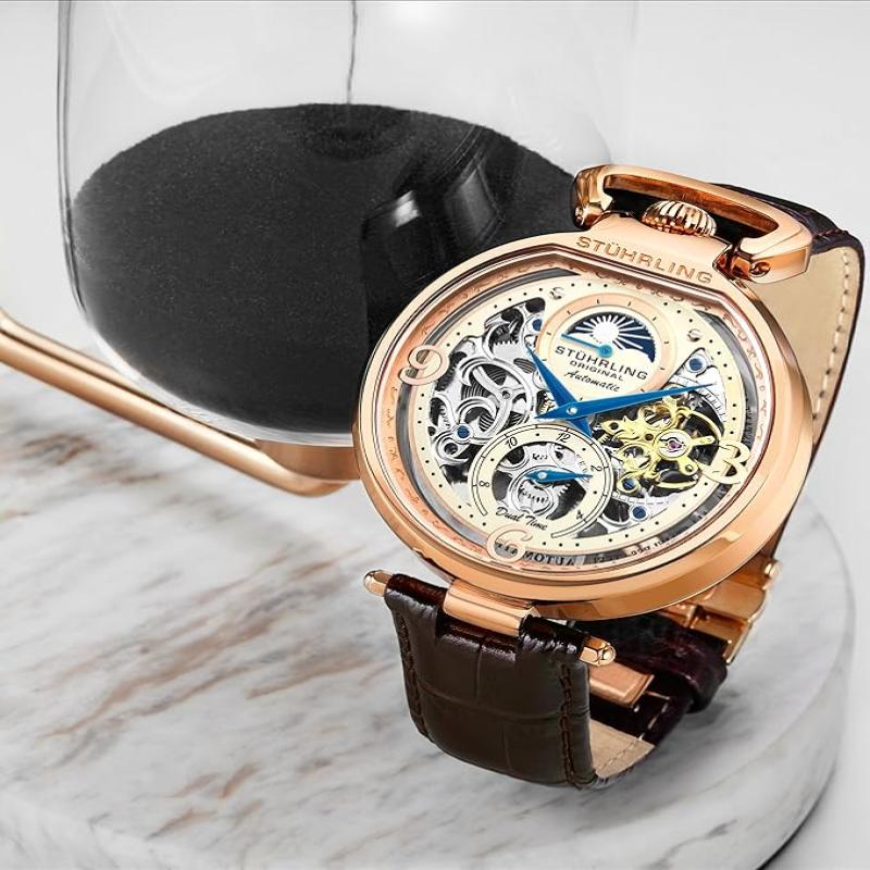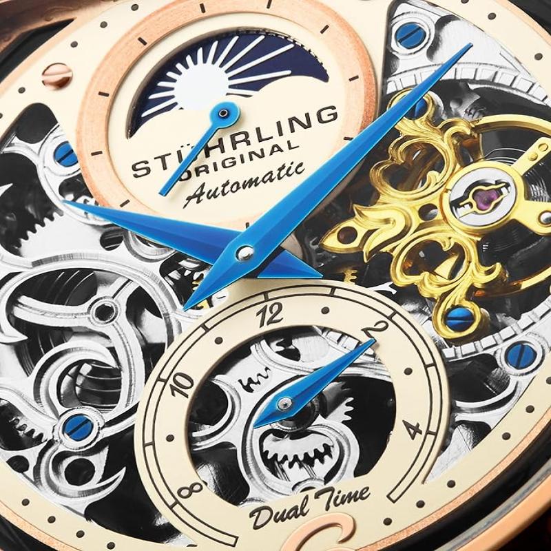 Stührling Original Mens Skeleton Watch Dial Automatic Watch with Calfskin Leather Band and - Dual Time, AM/PM Sun Moon