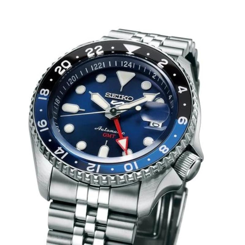 Automatic manual-winding capability Date display GMT (dual time display function) Lumibrite on hands and indices Rotating bezel Five-row bracelet 24 jewels Stainless steel 42.5 mm round dial 10 bar 2 Year International Warranty