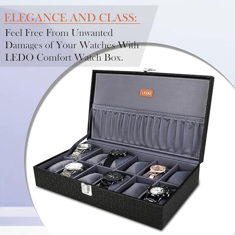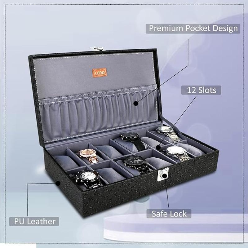 Stylish Gifting Option: Whether it's a birthday, wedding, anniversary, or simply a token of appreciation, this watch case is a timeless and stylish gift that will be cherished. Adaptable Storage: The removable pillows allow you to create space for other accessories, such as cufflinks, earrings, or various jewelry items. It's more than just a watch case; it's an all-in-one storage solution. Preserve Your Investment: Your watch collection represents an investment. The LEDO Watch Case helps you preserve the value and beauty of your timepieces. Elevate your watch organization and display with the LEDO Watch Case. Whether you're a collector or someone passionate about keeping their watches safe and stylish, this watch case is your perfect companion. Order now and experience the luxury and functionality it provides. Protect Your Investment: Your watch collection represents an investment, and the LEDO Watch Case helps you safeguard both the value and aesthetics of your timepieces. Elevate your watch organization and presentation with the LEDO Watch Case. Whether you're a dedicated collector or someone who appreciates the fusion of functionality and luxury, this watch case is the perfect addition to your collection. Secure your order today and experience the beauty and functionality it provides.