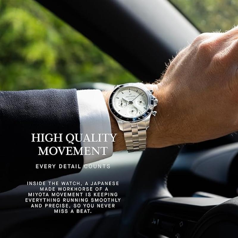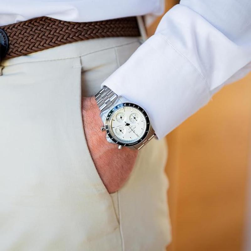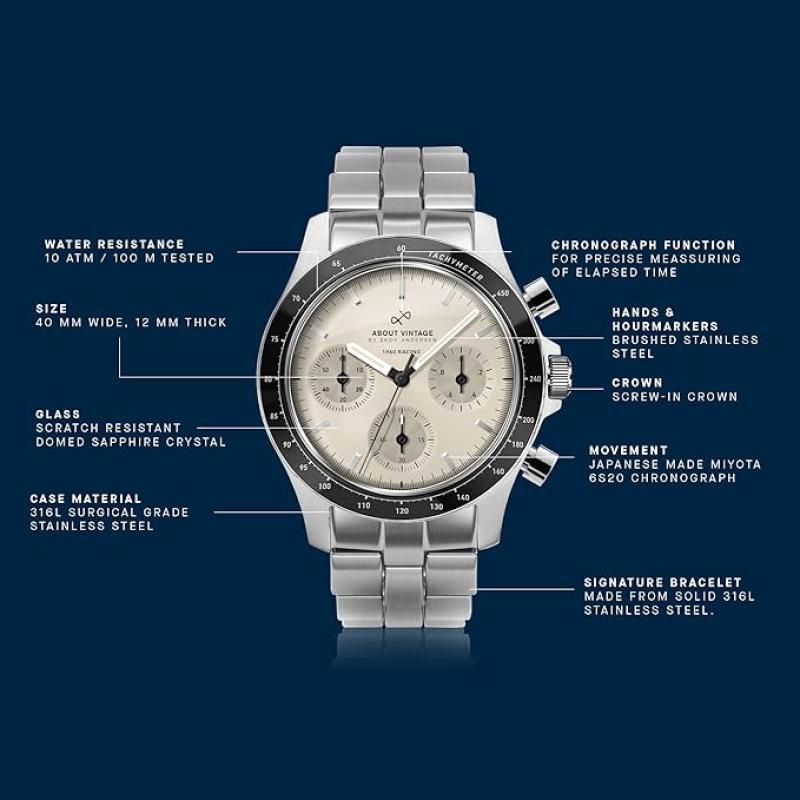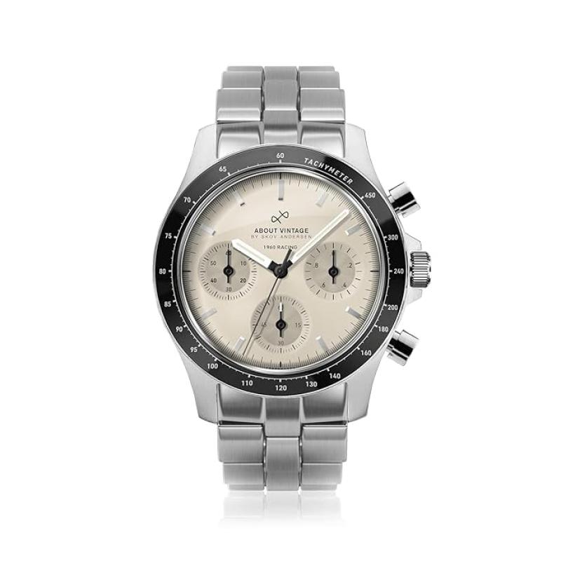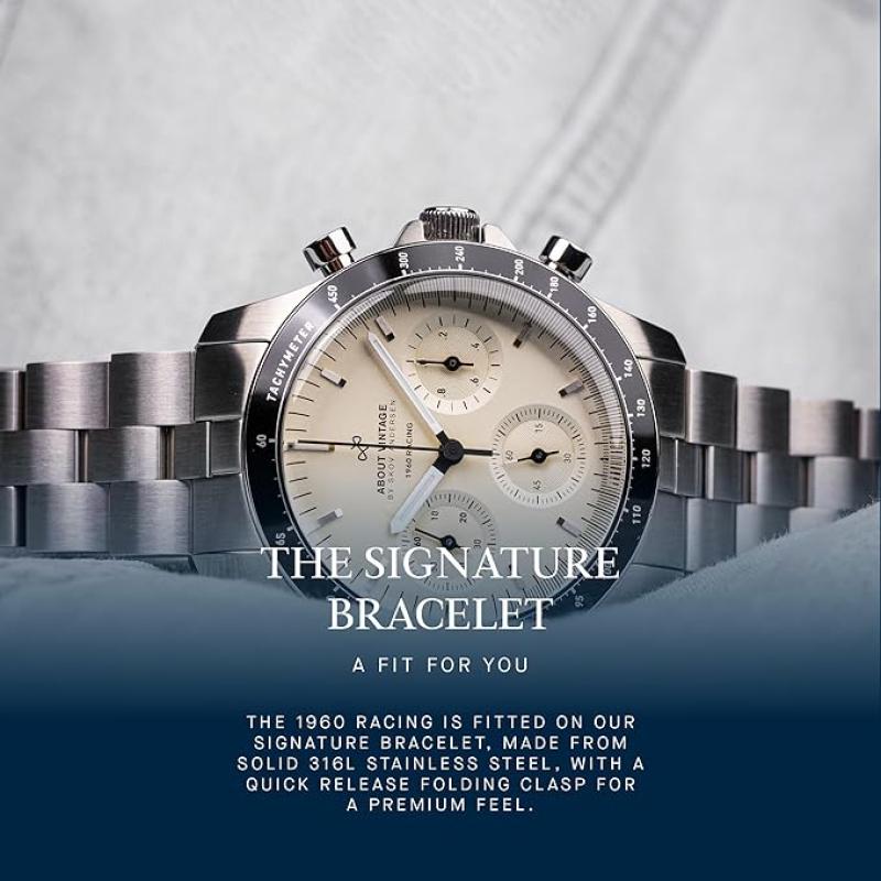 About Vintage 1960 Racing Chronograph Watch for Men - Steel Mens Watch - 316L Stainless Steel, Analog, Quartz, 10 ATM Waterproof Men Watches - Round Sapphire Crystal Dial Men Watch, Steel/Off White,