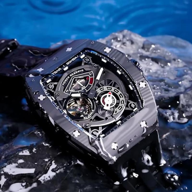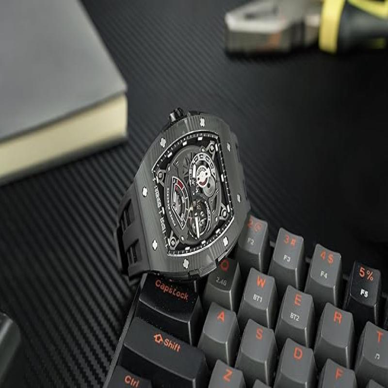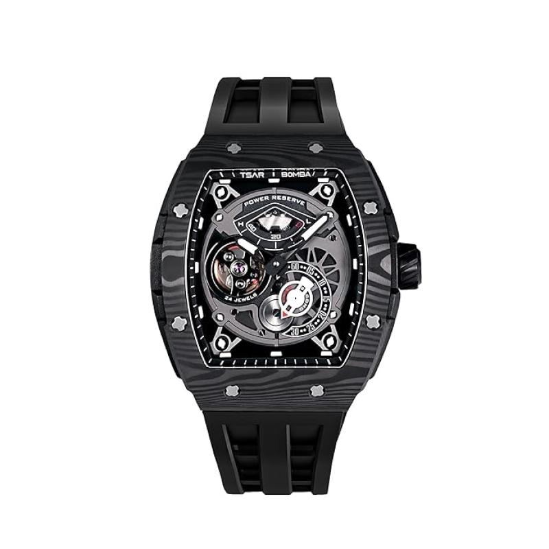 TSAR BOMBA Men's Standard Analog Automatic Movement Tonneau 12 Hour Time Display Wrist Watch (Cool Black)
