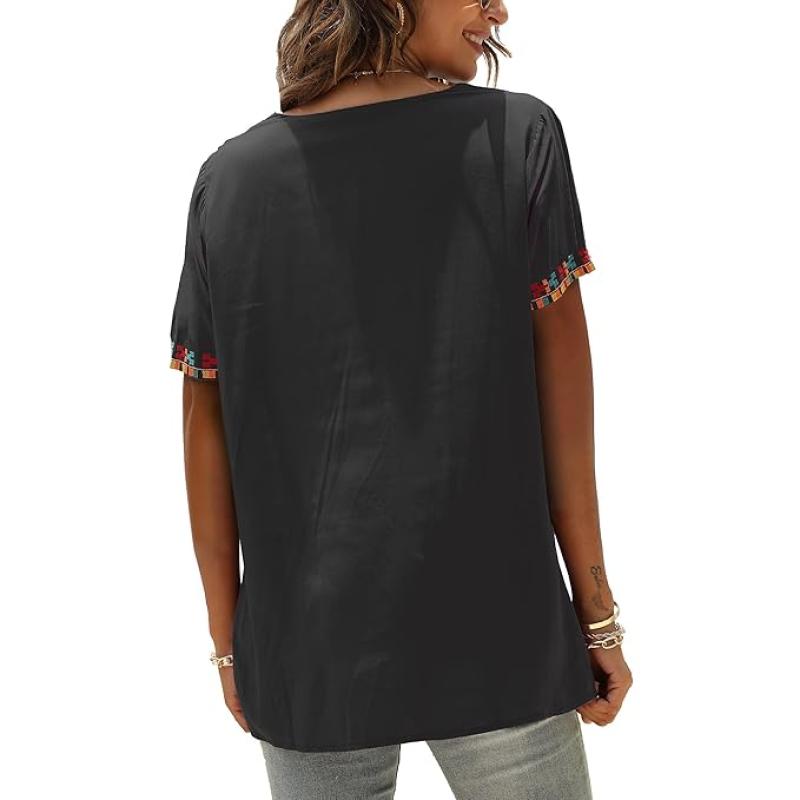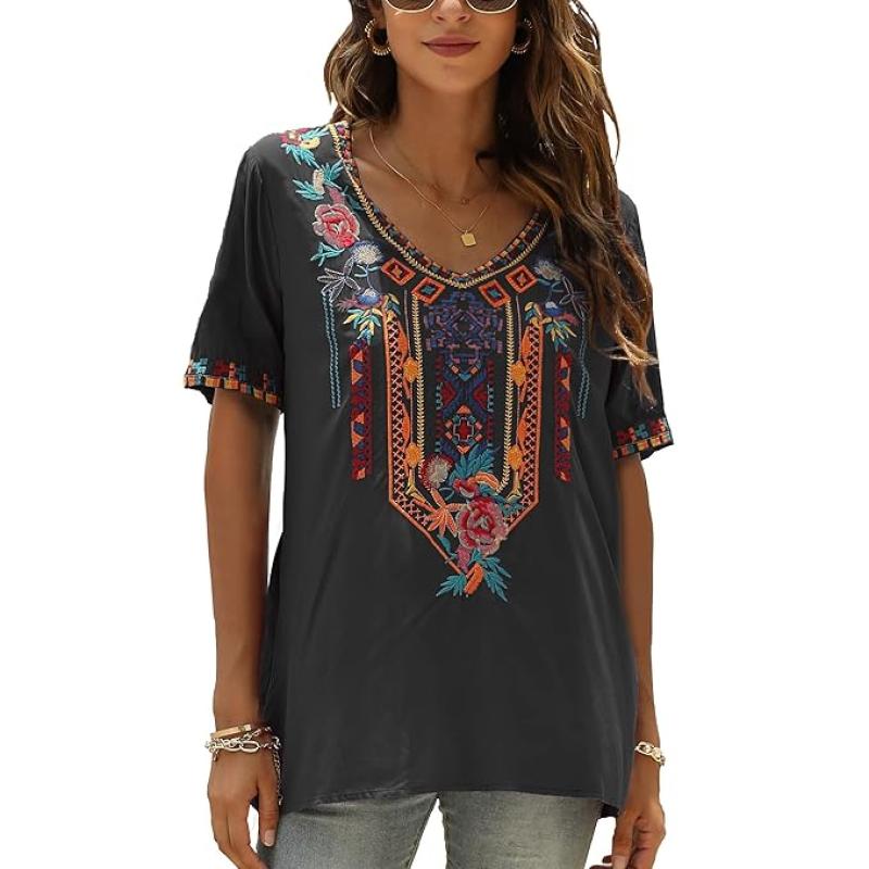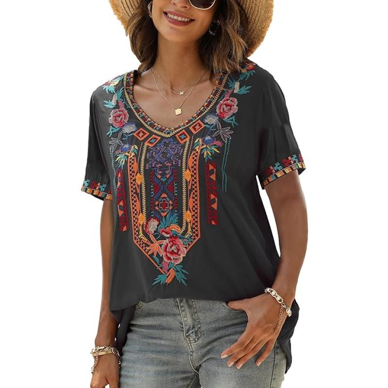 Mexican Embroidered Tops for Women Summer Short Sleeve Boho Shirts Peasant Blouses, Loose Fitting Bohemian Top Hippie Clothes